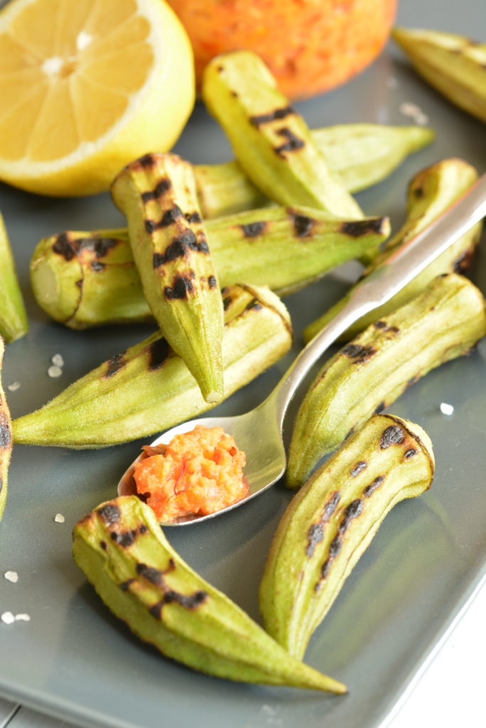 Gegrilde okra met citroen en romescosaus – 4 p.
