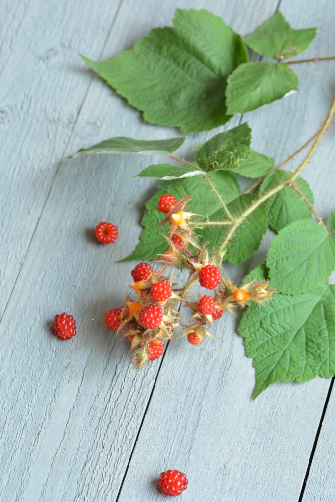 Zoals ieder jaar is rond deze periode de muur achter in onze tuin bedekt met takken vol rijpe wijnbessen. Ik heb het hier over het Japanse zusje van de framboos en de braam, de Rubus phoenicolasus, die zich in ons Nederlandse klimaat helemaal thuis lijkt te voelen. De vruchten van deze plant zijn kleiner dan die van haar familieleden, maar ze zijn zo sappig, fris en vol van smaak dat ze van de drie mijn absolute favoriet zijn.