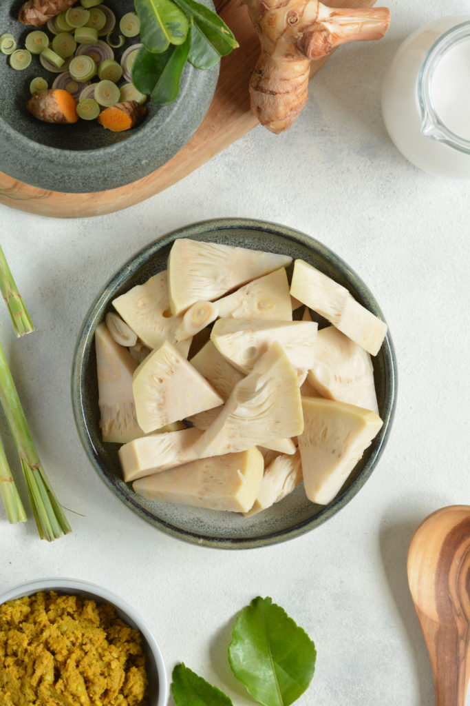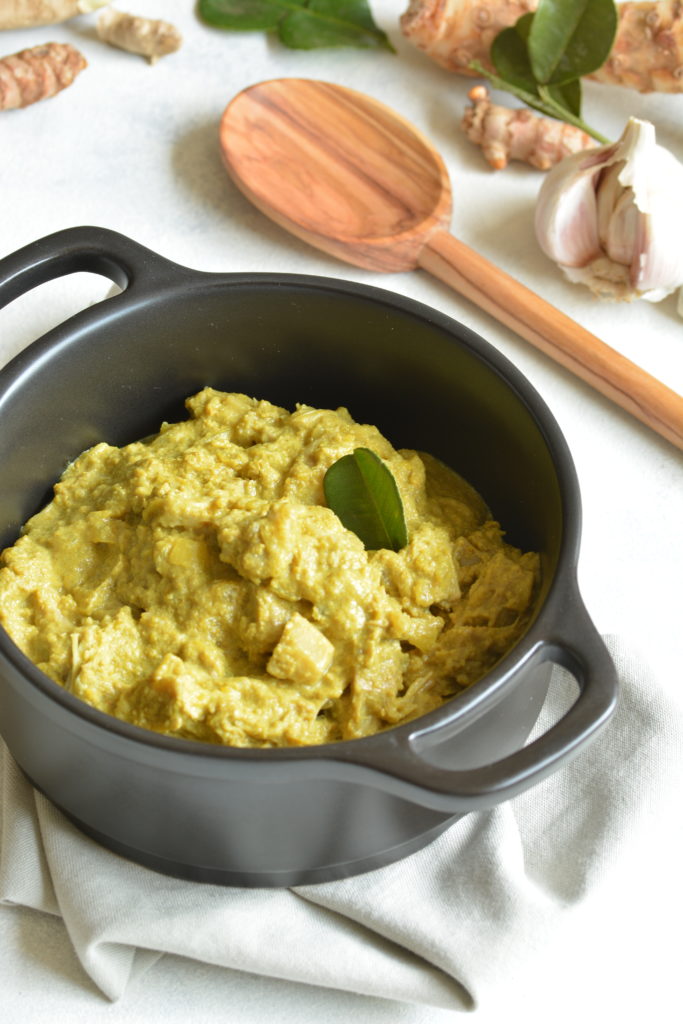 Traditioneel is rendang een rundvleesgerecht. Toch is de ster van dit gerecht niet het vlees, maar de heerlijke saus waarin het wordt gaargestoofd: een rijke mix van verse specerijen als gember, kurkuma en galanga, met de frisse smaak van citroengras en djeroek poeroetblad en de vriendelijke zoetheid van kokos. Dus als ik het tegenwoordig klaarmaak, vervang ik het rundvlees door blokjes groene jackfruit en laat ze in diezelfde saus sudderen tot ze zacht en vol van smaak zijn. Voor een extra hartige umamismaak laat ik een paar gedroogde paddestoelen met de saus meekoken en het resultaat is zo geurig en lekker dat je het recht uit de pan wil opeten!