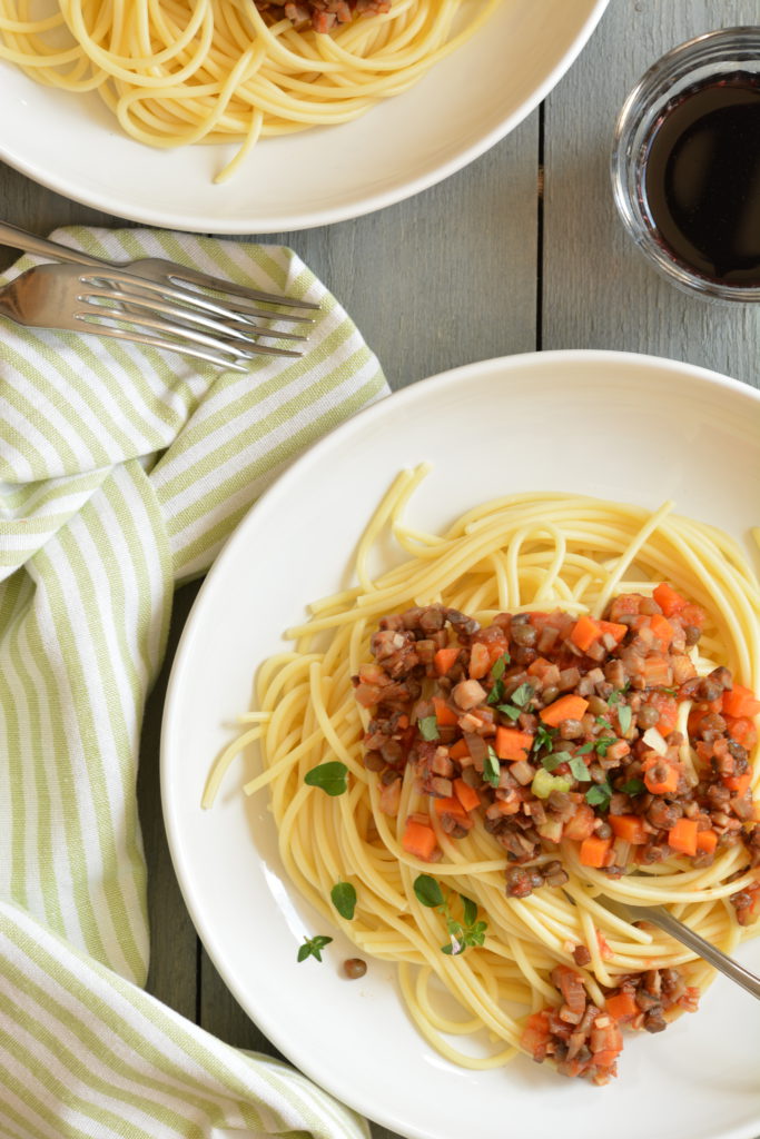 De herfst is in aantocht! Ik krijg weer zin in dekens op de bank, grote koppen thee en warme kommen comfort food. Een goed moment om een grote portie bolognese klaar te maken. Deze linzenbolognese, vol groenten en verse kruiden, is mijn favoriete vegetarische versie van de Italiaanse klassieker. Ik maak hem met Dupuis-linzen voor wat bite, kastanjechampignons voor hun sappige structuur en kruidnagels en jeneverbessen voor die diepe, warme smaak. De saus die je hiermee krijgt is kruidig, voedzaam, vol van smaak en tegelijkertijd licht en gezond.