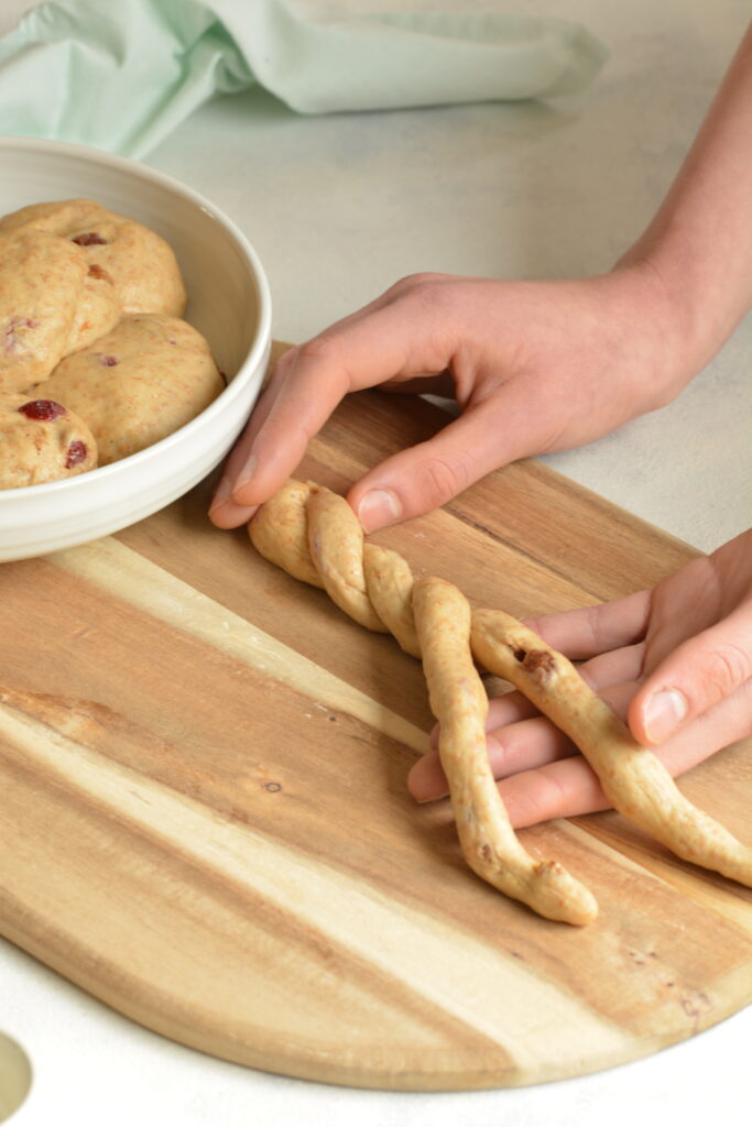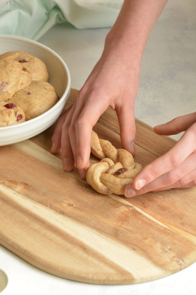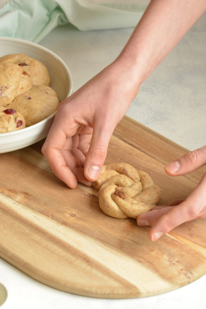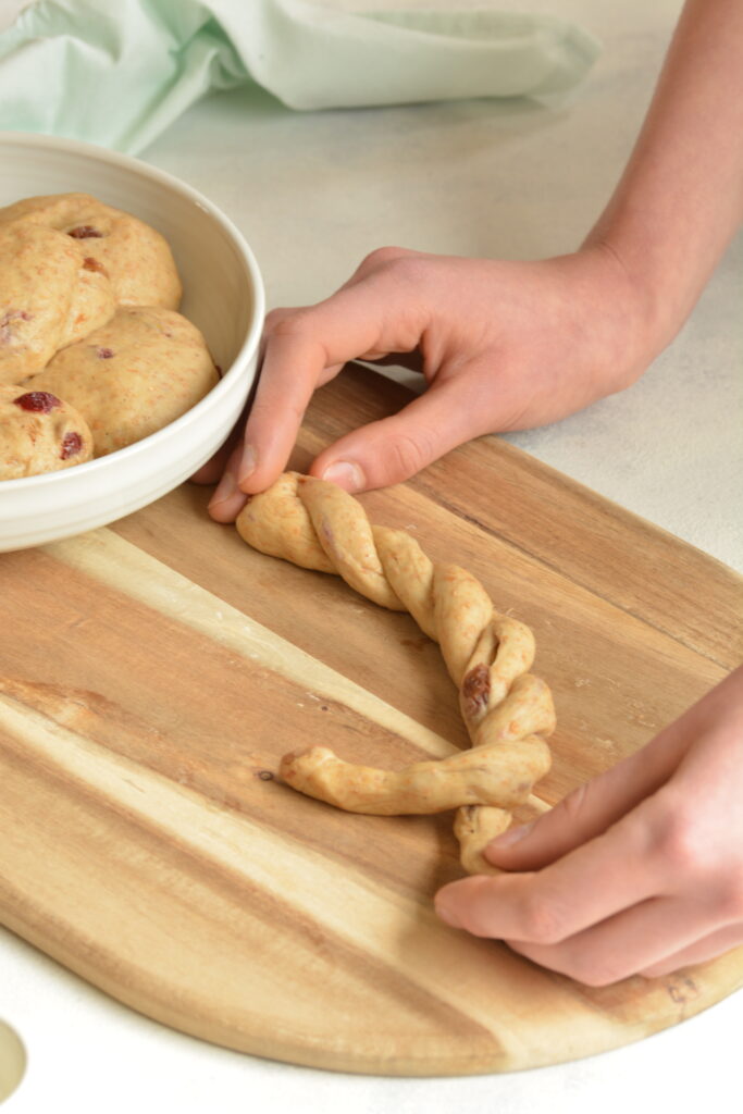 Druk de lucht uit het deeg en kneed het kort door. Vouw de rozijnen en cranberry’s door het deeg. Voeg, als het deeg te nat geworden is na de toevoeging van het gewelde fruit, eventueel nog een extra lepel bloem toe. Verdeel het deeg vervolgens in 10 porties (van elk ongeveer 70 gram) en vorm deze tot paasbroodjes naar keuze.