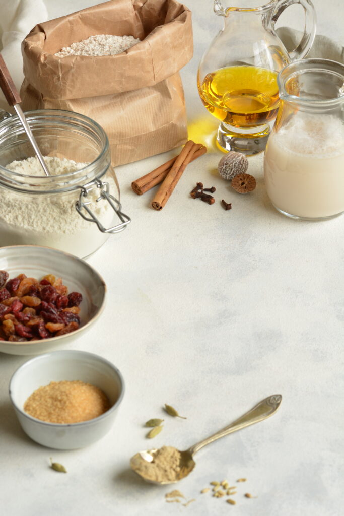 Deze paasbroodjes zijn gemaakt van een eenvoudig gistdeeg. Het is een mengsel van tarwebloem en volkoren speltmeel, licht gezoet met ruwe rietsuiker. Om het deeg op smaak te brengen heb ik een mengsel gebruikt van mijn favoriete vanille-chaikruiden. Kaneel, gember, kruidnagel, venkelzaad, vanille en een flinke dosis kardemom – het is nogal een lijst van verschillende potjes, maar samen maken ze de allerlekkerste broodjes en zorgen ze voor een heerlijke geur als het deeg in je kamer staat te rijzen. Voel je vrij om te experimenteren en, afhankelijk van wat je lekker vindt en in huis hebt, de smaken en verhoudingen naar je eigen voorkeur aan te passen!