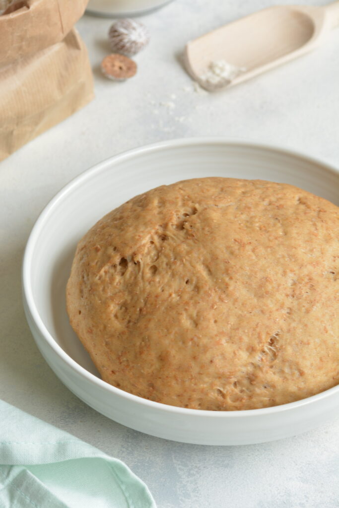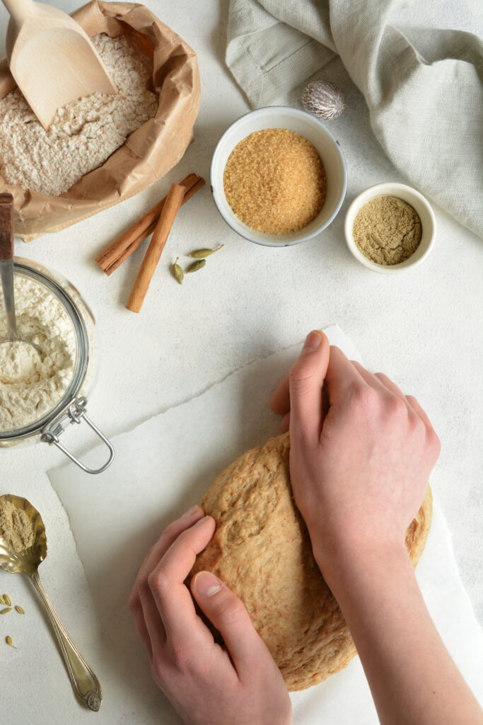 Meng in een grote mengkom het meel met de bloem, zout, specerijen en rietsuiker. Voeg de olie, het vanille-extract en het gistmengsel toe en kneed het geheel tot een soepel deeg. Het deeg moet vochtig, maar niet plakkerig zijn. Voeg wat extra bloem toe als het wel plakkerig is, of een lepel water als het te droog is.