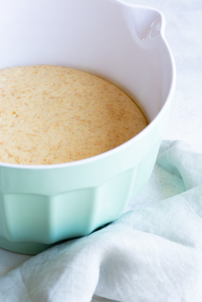 Bestrijk de mengkom dun met olie. Rol de deegbol hier doorheen tot hij met een dun laagje olie bedekt is. Dek de kom af met een vochtige theedoek. Laat het deeg op een warme plek ongeveer een uur rijzen, tot het in omvang verdubbeld is. In plaats hiervan kun je het deeg ook de avond van tevoren maken. Zet in dit geval de kom afgedekt in de koelkast wanneer het deeg begonnen is met rijzen. Laat het deeg de volgende ochtend een half uur op kamertemperatuur komen en ga dan verder met het recept.