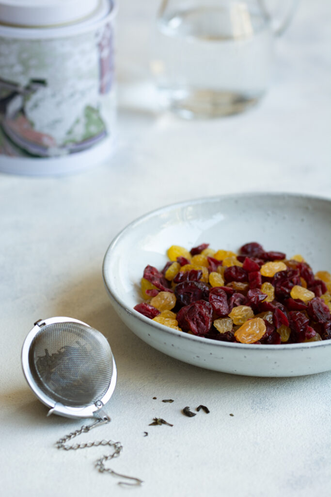 Verwijder het thee-ei, giet de rozijnen en cranberry’s af en dep ze droog met keukenpapier.